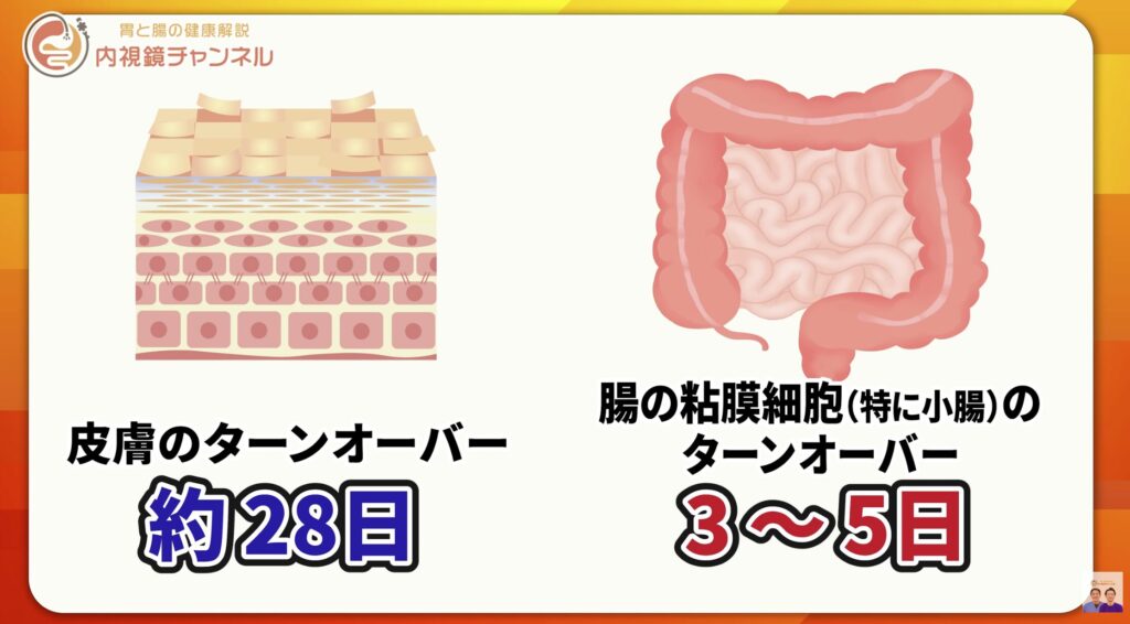 皮膚のターンオーバーが約28日であるのに対し、腸の粘膜細胞は3〜5日で入れ替わります。