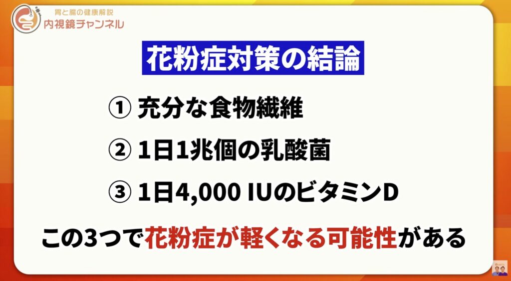 花粉症の方は腸内細菌の多様性が低下しているとされており、腸内環境を整えることは非常に重要な意味を持ちます。食物繊維を併せて摂取することで、善玉菌の増加も期待できます。