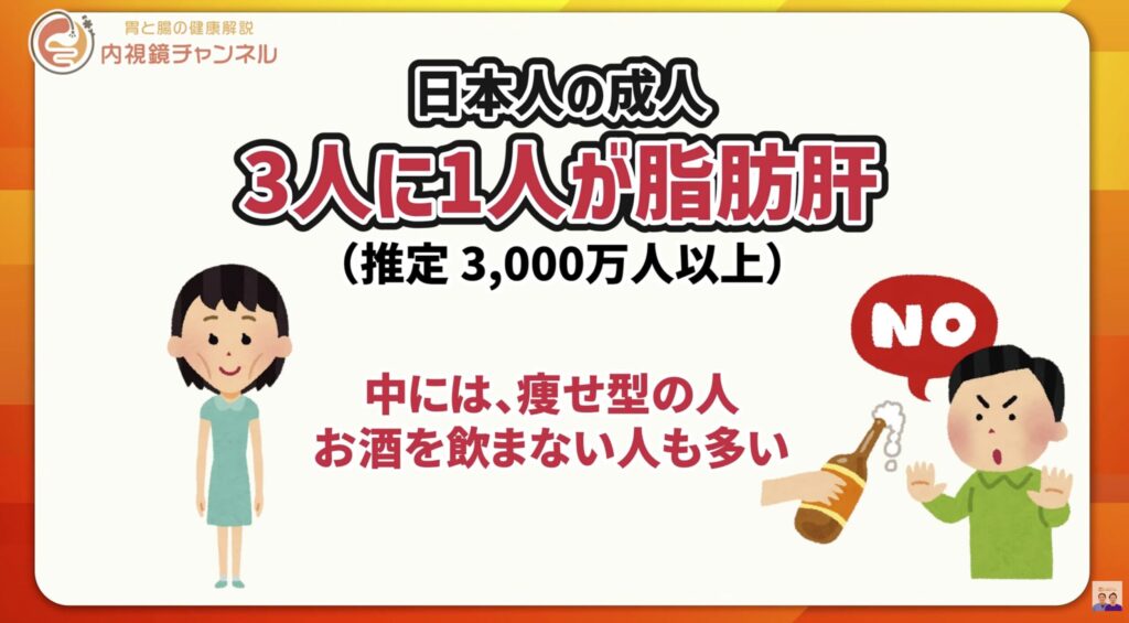 実は現在、日本人の成人の約3人に1人、推定3,000万人以上が脂肪肝といわれています。しかもその中には、肥満ではない人や、お酒をほとんど飲まない人も多く含まれています。