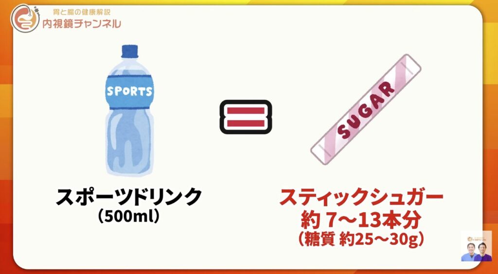 一見、体に良さそうに見えるスポーツドリンクですが、500mlあたりスティックシュガー約7〜13本分の糖質が含まれています。