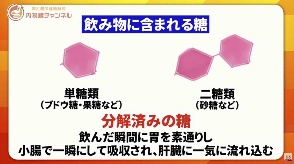 一方、ジュースや清涼飲料水に含まれる糖質は、すでに分解された「単糖類(ブドウ糖・果糖)」や「二糖類(砂糖)」です。