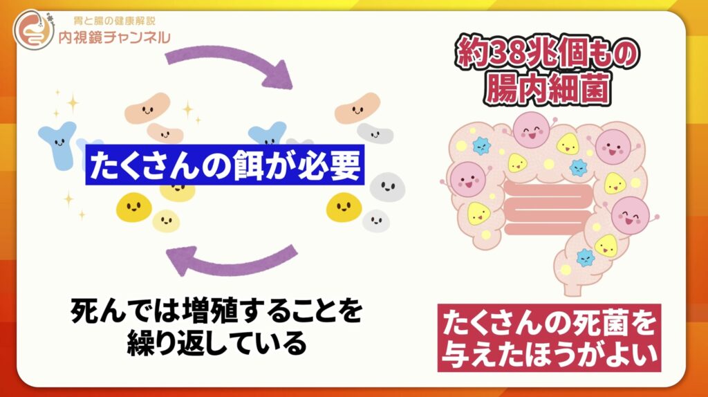 - 届いても“エサ”にはならない:生きている間は腸内細菌のエサになりません。結局は数日で死んで、そこで初めて腸内細菌のエサとなります。