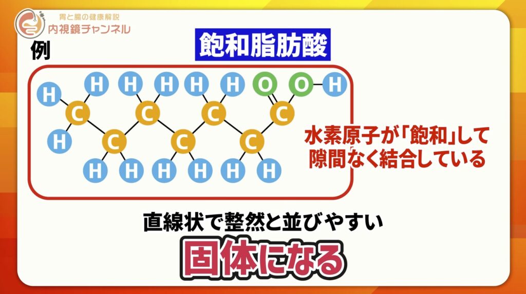 飽和脂肪酸は、化学構造的に炭素の鎖が水素でぎっしり満たされ、安定した構造をしています。