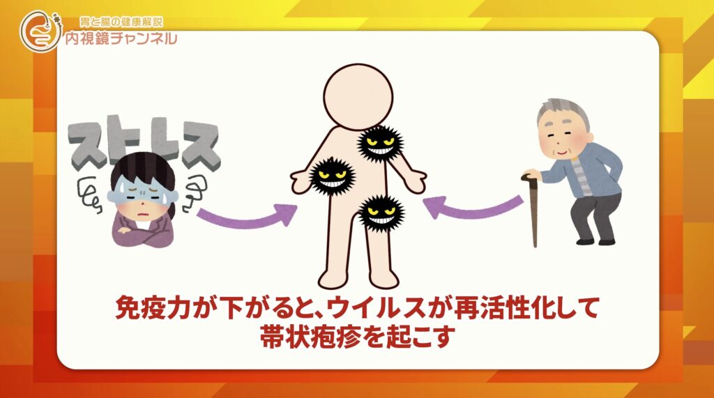 加齢、ストレス、過労、病気などで免疫力が一時的に低下したタイミングで、再び活性化すると帯状疱疹として発症します。