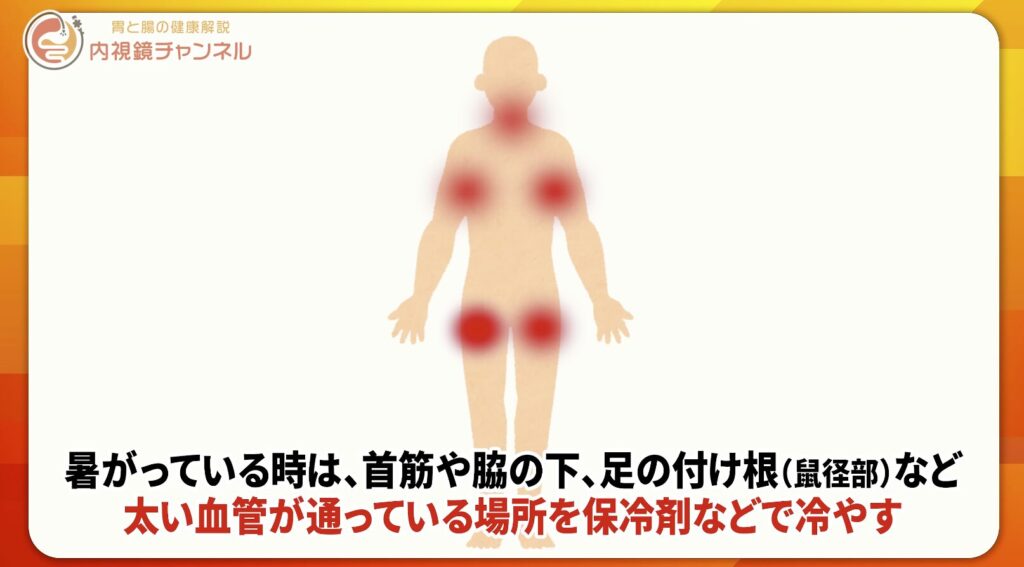 - 首・脇の下・鼠径部(太ももの付け根)を冷やす